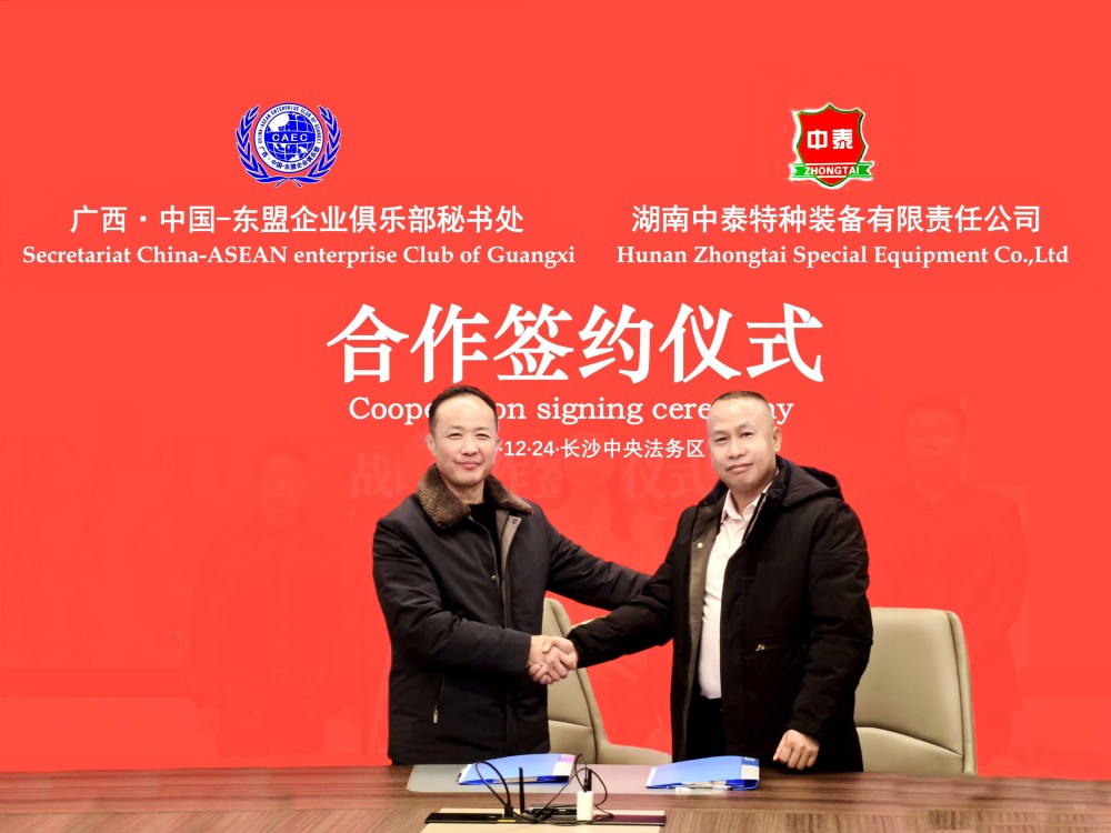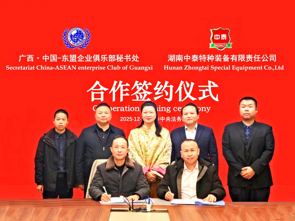2025年12月24日中国-东盟企业合作网讯;今天下午,“广西•中国-东盟企业俱乐部秘书处”与其会员企业“湖南中泰特种装备有限责任公司”在湖南(长沙)涉外中央法务区会议厅举行企业综合赋能服务合作协议续签仪式,俱乐部秘书处专家团将为中泰特种装备提供企业产品出海、金融、财税、法务、标准管理等赋能服务。