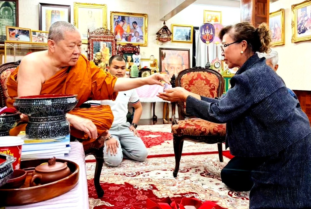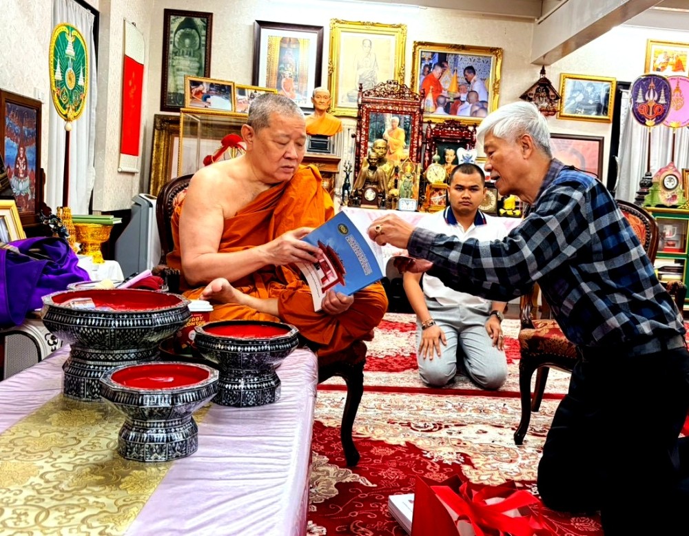 2025年12月25日,近日,中外抱团网荣誉主席、泰国世界百家姓艺术基金博物馆主席、泰国广肇会馆名誉理事长梁柱稳先生偕副主席梁关雪芬女士,前往位于曼谷三攀他旺区的岱密金佛寺,拜访泰国僧咖委员会中部僧咖委僧长、泰国海上丝路孔子学院理事会主席、泰国岱密中学孔子课堂理事会主席颂德帕拉玛哈拉差蒙坤牟尼(颂德通猜)。